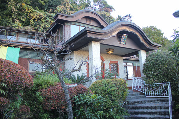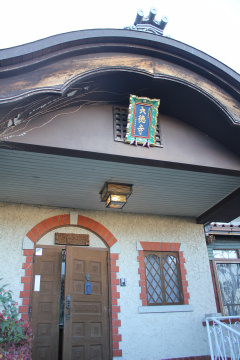 外部からは上部の屋根部分しか見えず、特に大きな違和感はないのですが、近くから全体を見ると何ともユニークな建物です。 ご住職のお話によると、元々は著名な画家が創作活動をされていた家で、それに唐破風を付け加えて寺院らしくされたそうです。 |